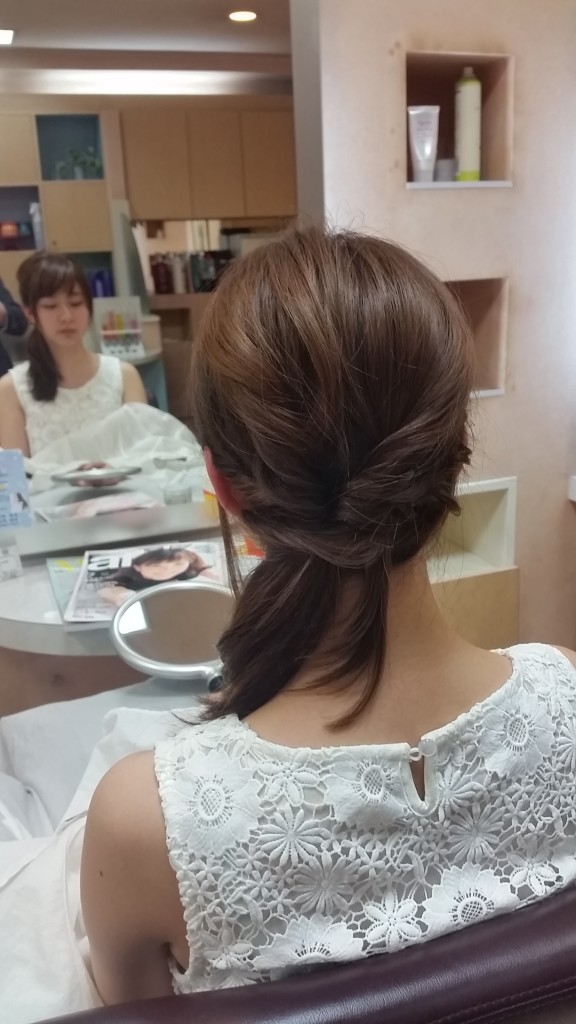 サイドの毛をひねりながら後ろのくるりんぱと合体させます。
